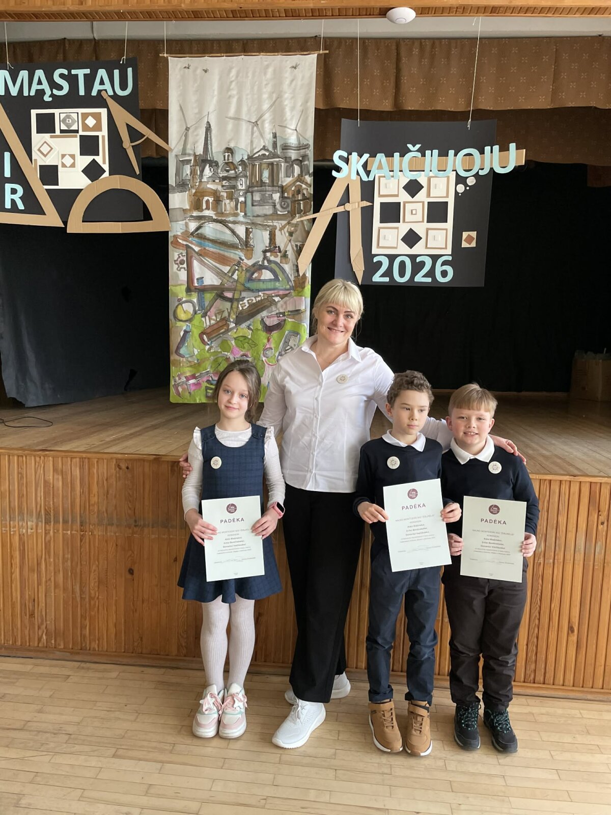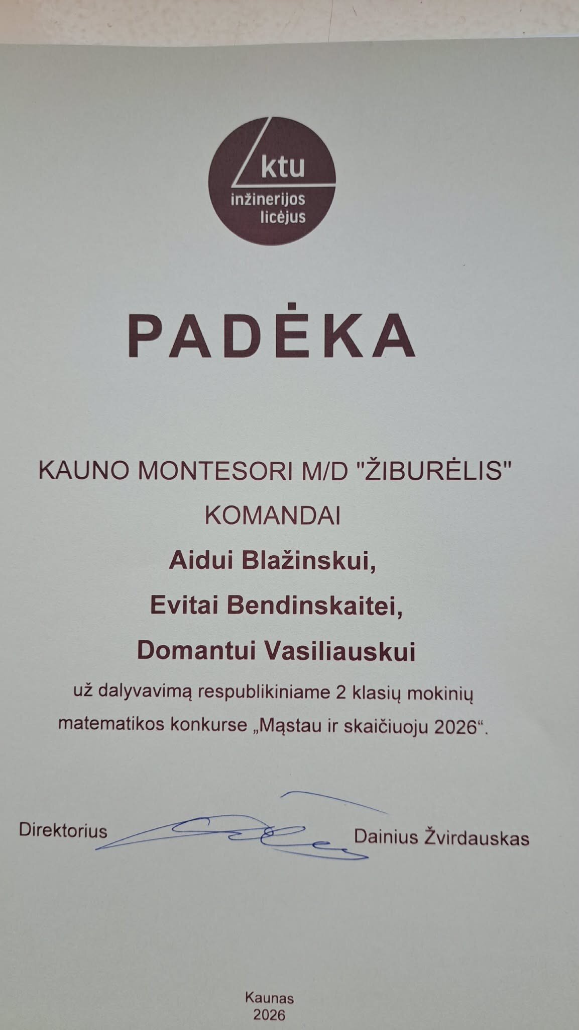 Džiaugiamės 2 klasės matematikų komanda, kuri sėkmingai dalyvavo respublikiniame 2 klasių mokinių matematikos konkurse „Mąstau ir skaičiuoju". Konkursas vyko KTU Inžinerijos licėjuje. Dirbdami komandoje Evita, Aidas ir Domantas pagilino matematines žinias ir tobulino bendradarbiavimo įgūdžius.