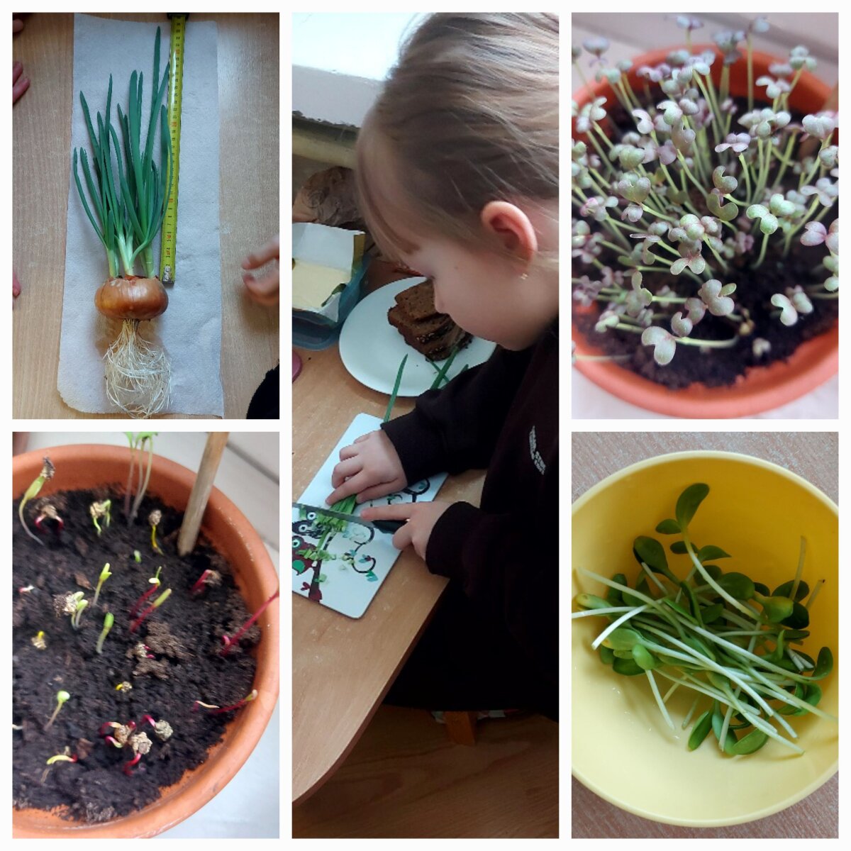 Visą kovo mėnesį „Pelėdžiuko" grupės ugdytiniai atliko eksperimentus su augalų sėklomis, svogūnėliais. Vaikai daigino, prižiūrėjo, stebėjo, matavo, uostė, skanavo pasėtus augaliukus. Mūsų projektas dar nesibaigė, nes palangė pasipildė naujais augalais, kurie greitai keliaus į lauko lysves.