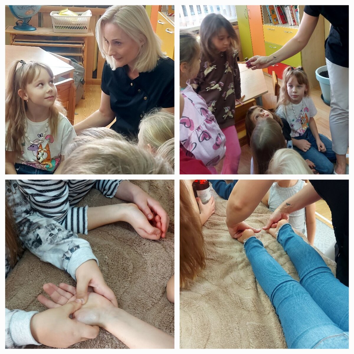 "Pelėdžiuko" grupėje svečiavosi Vasarės mama Nerija. Ji vaikams pristatė gydomojo masažo specialybę. Nors pati mama yra inžinierė, bet, kaip ji pati sakė, niekada nevėlu išmokti naujų dalykų, kurie mieli tavo širdžiai. Nerija priminė vaikams, kad darbas atliktas su meile džiugins ne tik jus, bet ir aplinkinius. Džiaugiamės šia kvapų, pojūčių ir garso valandėle praleista kartu su Nerija.